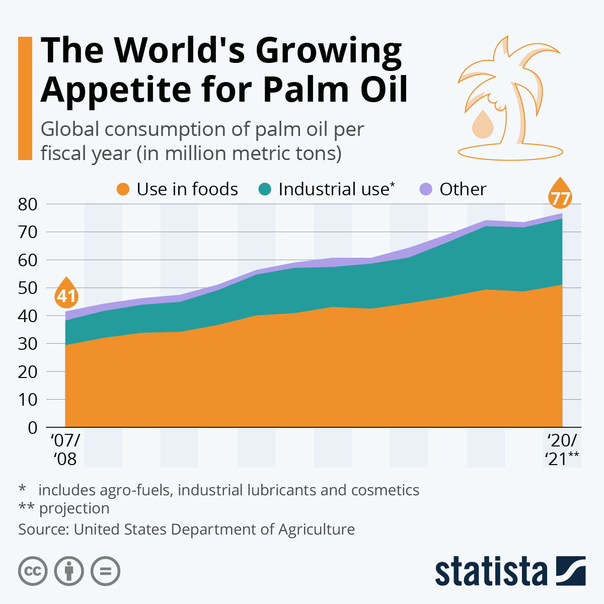 The production of palm oil leads to widespread deforestation and loss of biodiversity. It has destroyed a major part of the Amazon forest and is also responsible for 60% of the deforestation in Indonesia.