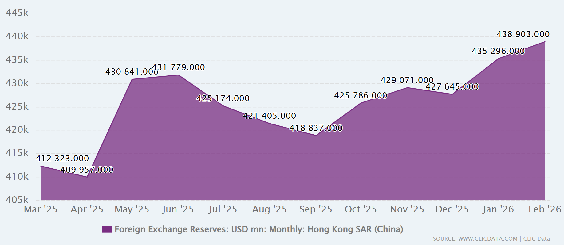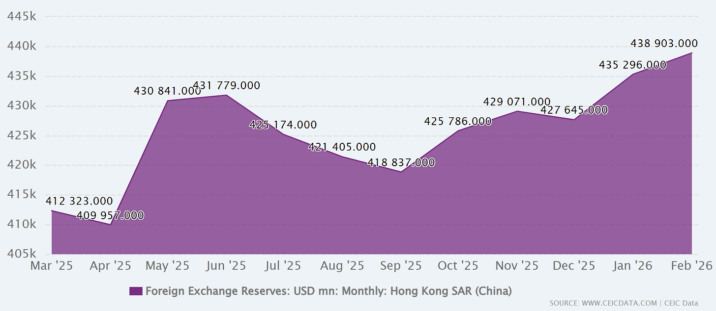 Backing all of this is Hong Kong’s formidable war chest. By December 2025, the territory held US$427.6 billion in foreign exchange reserves. That’s over five times the currency in circulation and about 37% of total HKD M3. The system’s credibility rests entirely on this buffer.