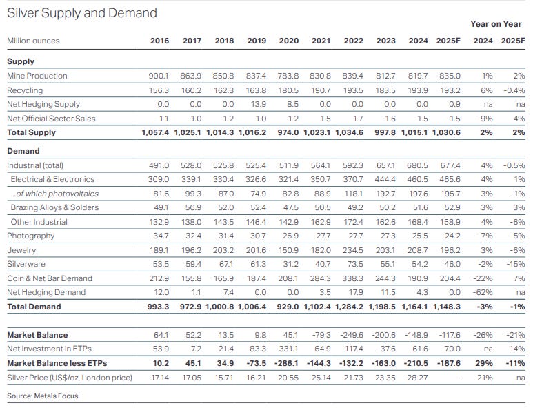Recycling is hitting physical limits. Total silver recycling reached a 12-year high of 193.9 million ounces in 2024 but year on year growth has not followed.