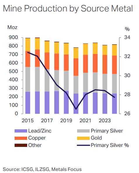 The silver market’s troubles begin underground. Mine production grew just 0.9% in 2024 to 819.7 million ounces, despite prices jumping 21% that year. The reason is simple physics. 72% of silver comes as a byproduct of copper, lead, and zinc mining.