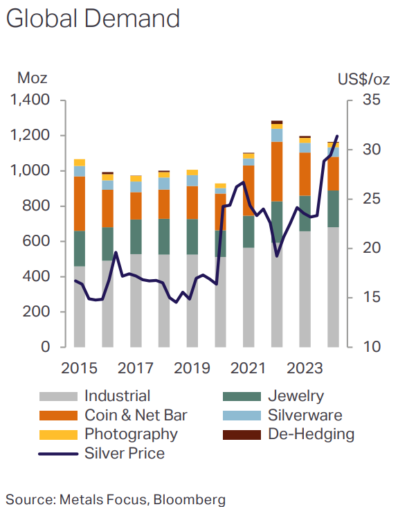 What matters is the demand pattern. Industrial demand hit a record 680.5 million ounces in 2024, representing 59% of total consumption. Silver is transforming from primarily a precious metal into an industrial commodity.