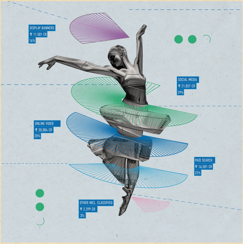Online video follows closely at 28% (₹20,004 crore).