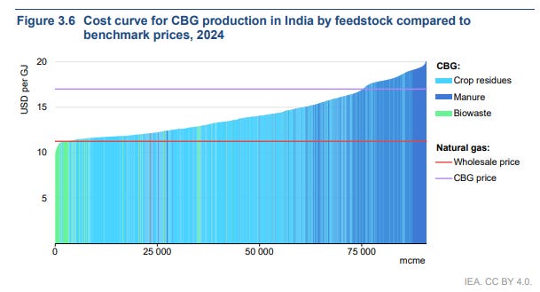 The IEA estimates India could sustainably produce up to 90 billion cubic metres equivalent of CBG every year. For context, that’s about 120% of India’s entire natural gas demand in 2024.