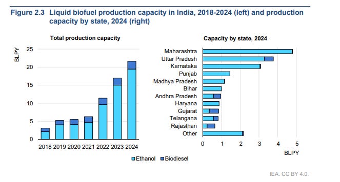 India’s biofuel production has more than doubled from 101 petajoules in 2018 to 210 petajoules in 2024. That’s enough energy to power all of Mumbai’s electricity needs for an entire year.