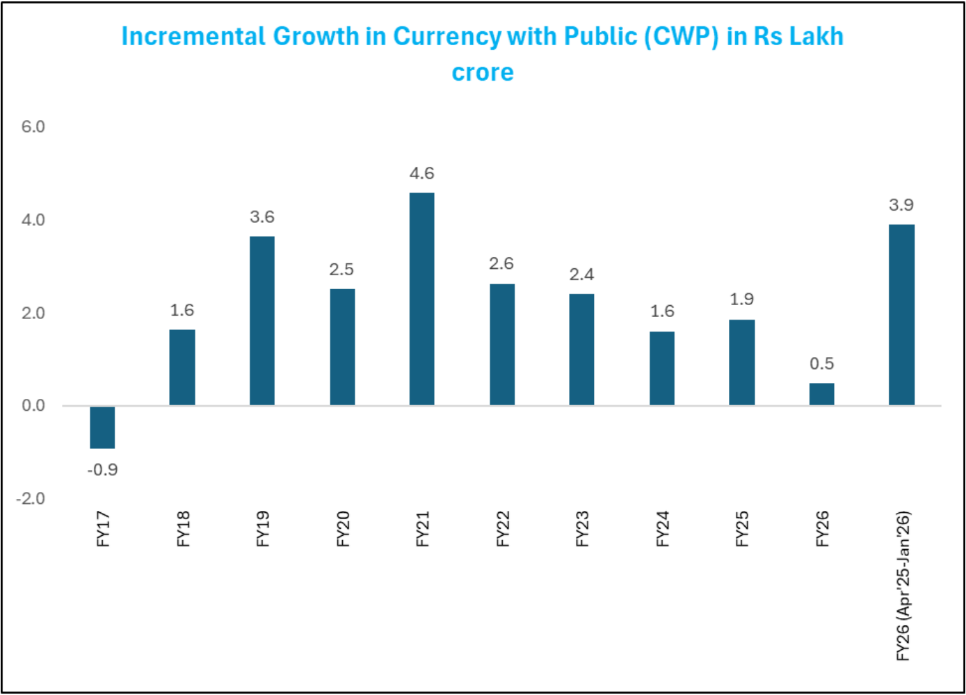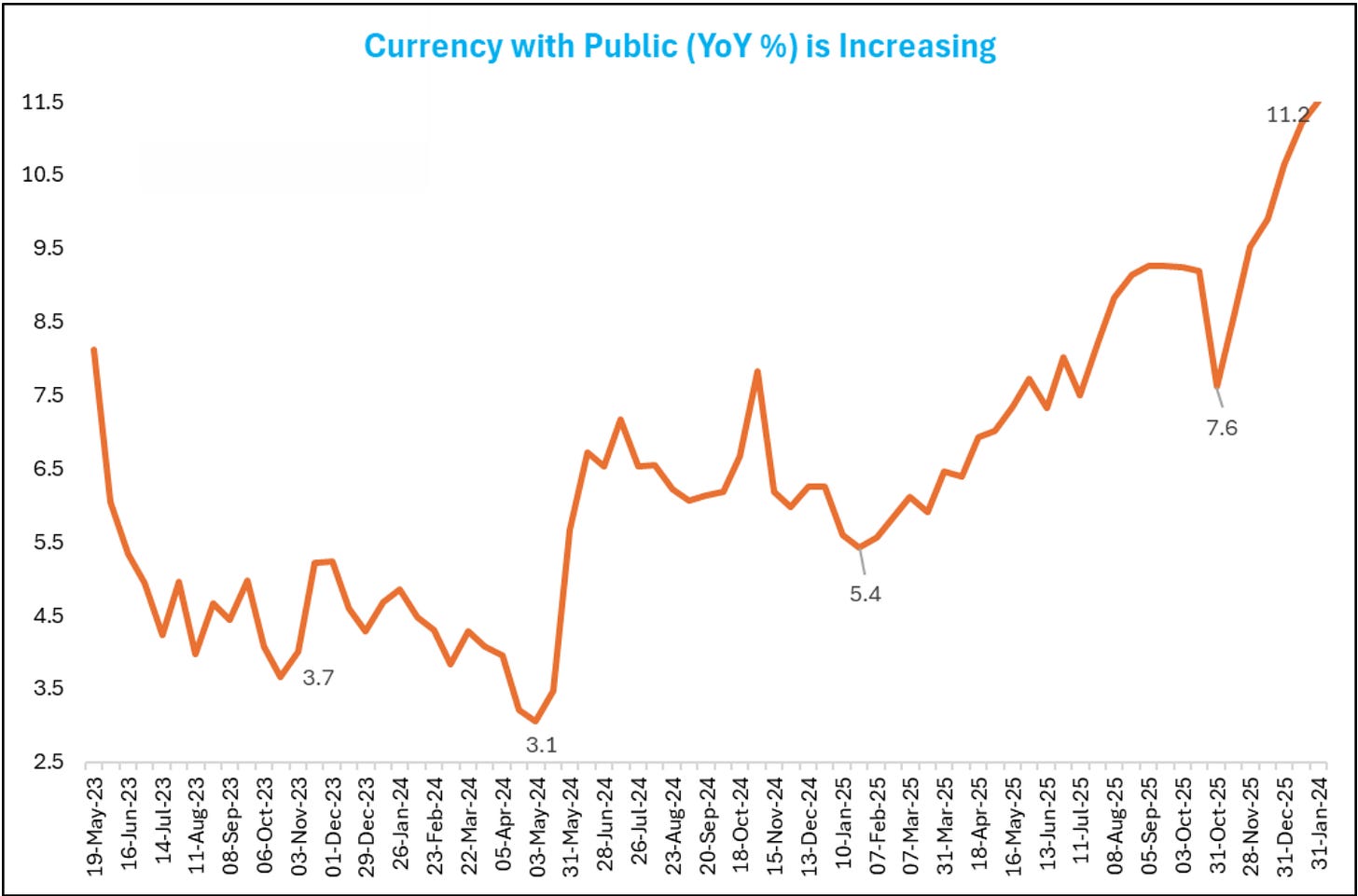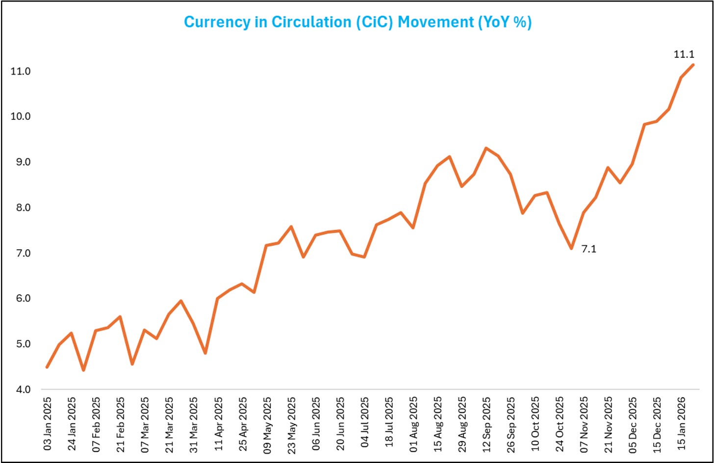 India’s total currency in circulation (CiC) hit an all-time high of approximately ₹40 lakh crore in January 2026. This was an 11.1% YoY growth, and more than double the 5.3% growth recorded the previous year. The currency sitting directly in the hands of the public, called Currency with Public, is ₹39 lakh crore and growing just as fast at 11.5% YoY.