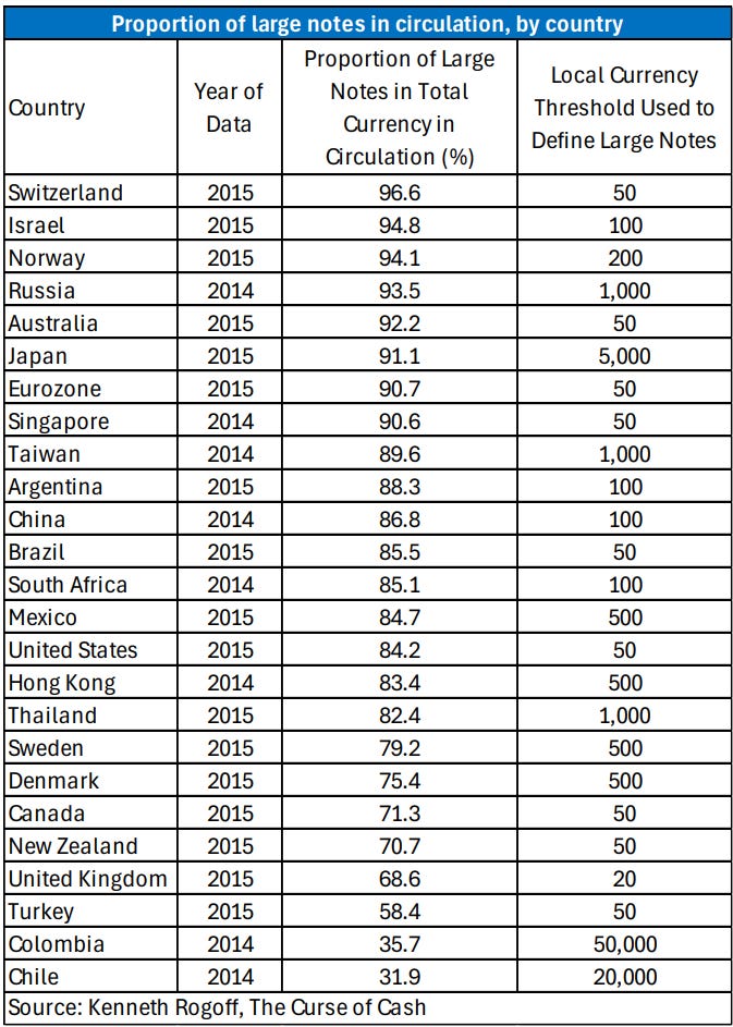 Kenneth Rogoff is a Harvard economist who wrote “The Curse of Cash” in 2016. According to Kenneth, eliminating larger denomination notes was impossible to engineer. He argued that large-denomination notes were a massive policy problem, used disproportionately to facilitate tax evasion and shadow economic activity. His data showed that in most advanced economies, large notes account for over 80% of total currency value. Eliminating them, he said, was politically and practically treacherous.