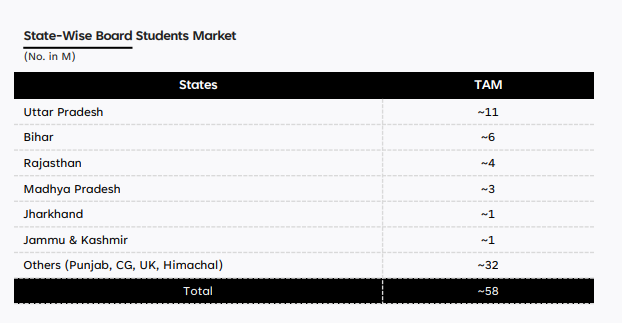 State board exam preparation has emerged as the fastest-growing segment of the online business. And the opportunity here is staggering. The Hindi-speaking states that PhysicsWallah currently serves like UP, Bihar, Rajasthan, Madhya Pradesh, Jharkhand represent about 58 million students. Local tutors for these board exams often charge ₹15,000 to ₹25,000 per year. PhysicsWallah offers similar courses at a tenth of that price.