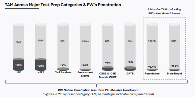 According to PhysicWallah’s RHP, the test preparation market in India is worth about ₹1-1.1 lakh crore today. PhysicsWallah’s primary battlefield, the online segment, is currently worth around ₹14,000 crore but is projected to grow at 29% annually to reach ₹50,000-55,000 crore by 2030. That’s a four-fold increase in five years. And there’s more. Even within JEE and NEET, online penetration remains below 2%. PhysicsWallah has roughly 20% market share in these categories, yet claims it’s barely scratched the surface.