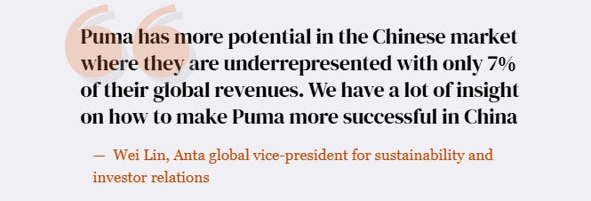 Anta’s Global VP said it plainly: “Puma has more potential in the Chinese market where they are underrepresented. We have a lot of insight on how to make Puma more successful in China.”